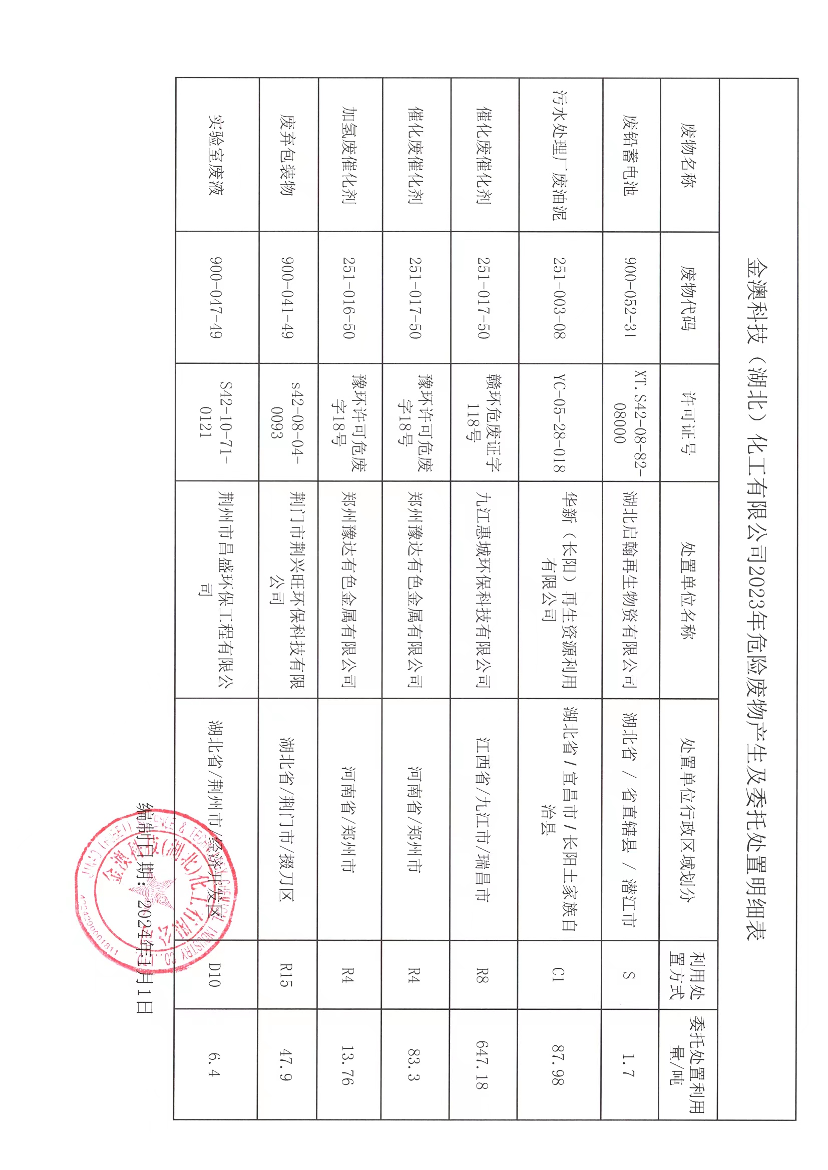 金澳科技(湖北)化工有限公司2023年危险废物产生及委托处置明细表