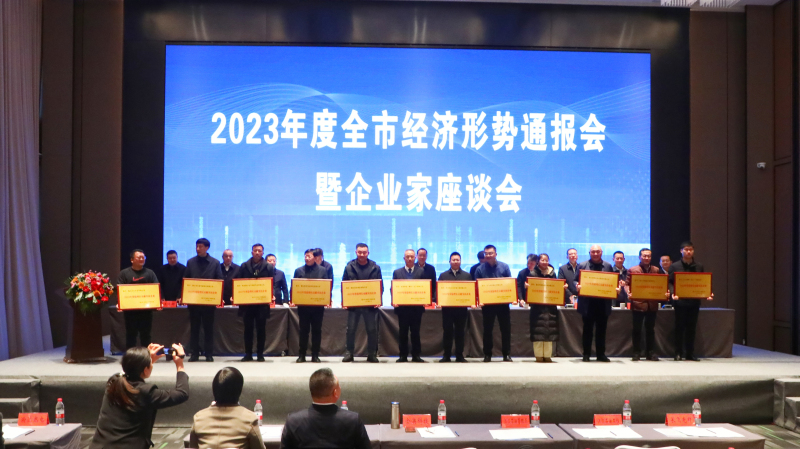 市政府党组成员、副市长赵曜宣读《市工业经济工作领导小组关于表扬2023年度国家、省专精特新企业、稳增长贡献突出企业、经济贡献突出企业的通报》。