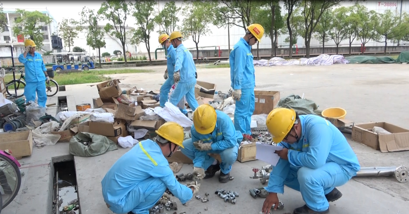 物流公司副总经理谢胜良组织油库当班员工更换库区消防水池根部阀门,确保消防设施完好。